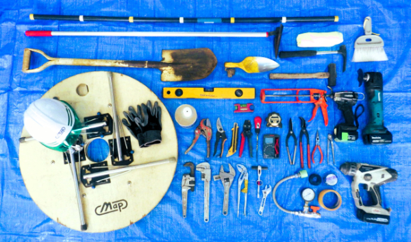 「潅水設備工事」ではマンションなどの新築工事現場で植物に水をあげる設備の施工をします。地上、屋上、壁面にある緑地に塩ビ管や潅水ホースを配管し、電磁弁と制御盤を取り付けて自動制御にします。時には緑化パネルの設置などもします。